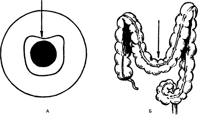 Сужение нисходящей кишки (B. Iensen, 1964): А – радужка; Б – толстая кишка