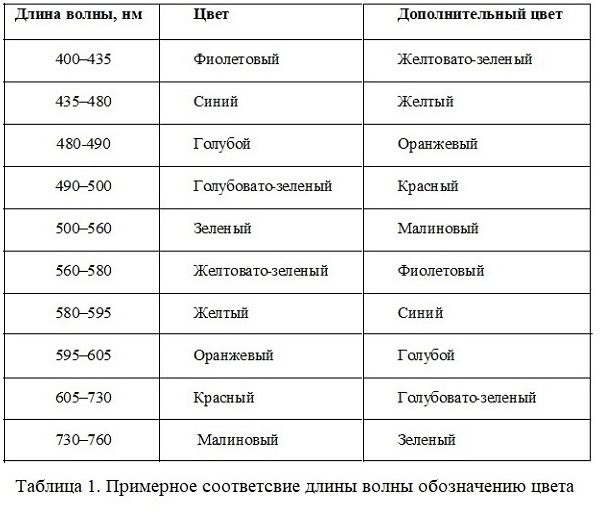 В таблице 1 представлен один из многих вариантов сопоставления длины волны с нашим ощущением и определением цвета. В таблицу добавлен столбец, содержащий названия дополнительных цветов. Любая пара основного и дополнительного цвета при смешении является бесцветной, и белый предмет, освещённый такой парой цветов, выглядит белым.