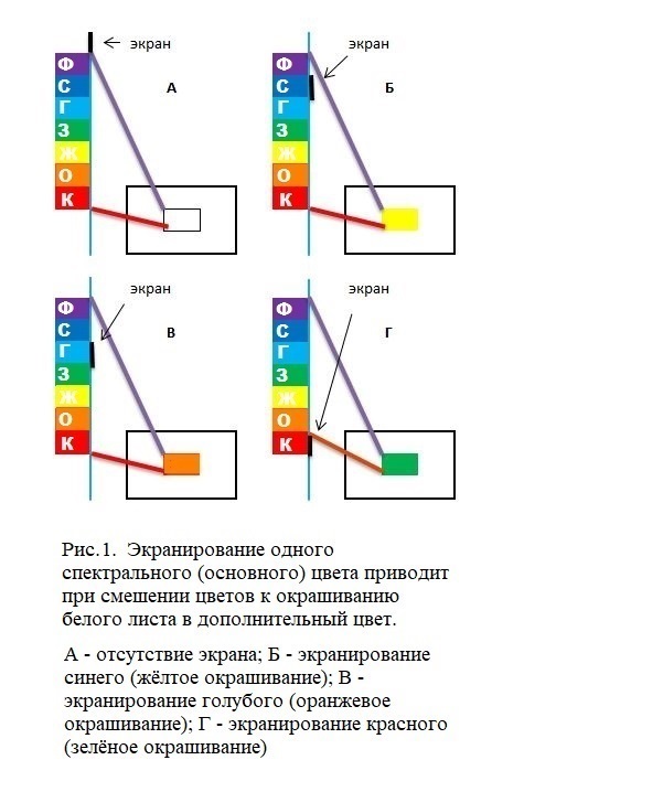 Дневной свет в результате смешения всех цветов с дополнительными бесцветен, а освещённый таким полихромным (многоцветным) светом белый предмет выглядит белым, поскольку отражает весь диапазон длин волн света. Если перед листом белой бумаги разложить освещающий свет с помощью призмы на спектральные составляющие (опыт Ньютона, школьный курс физики), экранировать одну из них и снова "сложить", мы увидим не белый, а окрашенный участок этого листа, освещённого "обеднённым" светом. Убирая синий, мы получим жёлтое окрашивание, убирая голубой – оранжевое, убирая красный, получим зелёное (рис. 1). Таким образом, изъятие из всего спектра всего одной спектральной составляющей приводит к его окрашиванию в дополнительный цвет. В данном случае все дополнительные цвета – парами, поэтому в сумме дают белый, а один из них – без пары, поэтому не "нейтрализуется" и окрашивает белый лист "в себя".