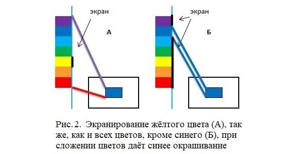 Чтобы получить один и тот же цвет, можно вычесть не только один дополнительный (см. выше), но и все цвета, кроме нужного. Например, экранируя жёлтый, мы получаем синее окрашивание, и точно такой же результат получается при экранировании всех цветов, кроме синего (рис. 2). Отличие в том, что в первом случае объект освещён спектрально богатым полихромным светом (только лишь без жёлтого), а во втором – бедным монохромным (только синим), поэтому при одинаковом тоне (цвете) в первом случае цветовое пятно гораздо ярче, чем во втором. Это важно для понимания цвета приманки в воде: полихромный свет гораздо ярче монохромного света одного с ним цвета.