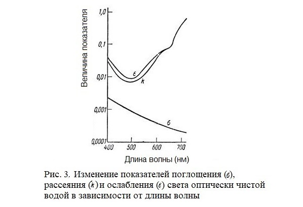 Это связано с изменением спектрального состава света вследствие избирательного ослабления водой его крайних диапазонов (рис. 3, по Рогов А.А, 1964). Ослабление (аттенуация) складывается из процессов поглощения (наиболее интенсивного для красного и инфракрасного диапазонов спектра света) и рассеивания (наиболее выраженного для фиолетового и ультрафиолетового). В результате чистая вода, например, горных озёр, заполненных талой водой ледников, в глубине и выглядит голубой, и освещает находящиеся в её толще предметы голубым светом.