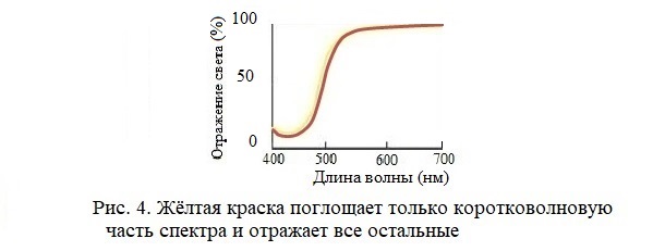 Краски, которыми красят приманки, поглощают определённые участки спектра, а то, что отражается, мы и воспринимаем как тот или иной цвет. Нужно помнить, что чистых красок не бывает и в большинстве своём они отражают свет в довольно широком диапазоне (рис. 4), что по эффекту близко к экранированию одной спектральной составляющей и пропусканию остальных. Мало того, один и тот же цвет мы можем получить как с помощью одной краски, так и с помощью смешивания разных красок. Теоретически, продолжая "замешивать" краски, мы можем добиться поглощения практически всех спектральных составляющих и "на выходе" получить отражение, равное нулю. Это и будет чёрный цвет. На практике, в силу "несовершенства" красок, чёрный не получается, поэтому используются чёрные пигменты, например, сажа, которая поглощает практически весь световой поток. Поскольку чёрному пигменту всё равно, что поглощать, ничего не отражая, чёрная приманка остаётся чёрной и в воде.