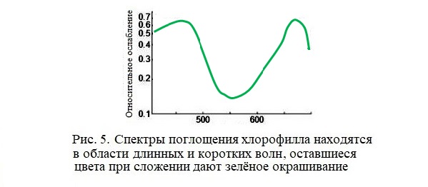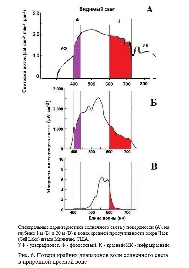 Например, органические молекулы и мельчайшие частицы гумуса максимально поглощают коротковолновые составляющие спектра от ультрафиолетового до зелёного. Спектры поглощения хлорофилла (рис. 5, из Lythgoe, 1979, адаптировано) располагаются как в коротковолновом (фиолетовый и синий), так и в диапазоне длинных волн (оранжевый и красный). Остаются голубой, зелёный и жёлтый. В результате пресная вода, богатая органикой, в глубине выглядит летом желтовато-зелёной. Чем меньше органики, тем цвет воды в глубине ближе к голубому (зимой).