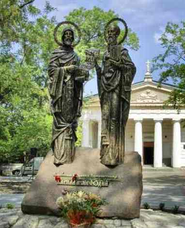 Рис. 16. 18 апреля 885 г. умер Святой Мефодий, старший брат и соавтор Святого Кирилла, проповедника, создателя славянской азбуки "кириллицы". Иллюстрация – памятник Кириллу и Мефодию в Севастополе.