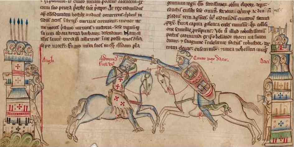 Рис. 20. 18 октября 1016 г. датчанин Кнут Великий побеждает в битве при Ассандуне короля Англии Эдмунда и завоевал Англию. Иллюстрация из средневековой книги конного поединка двух королей.