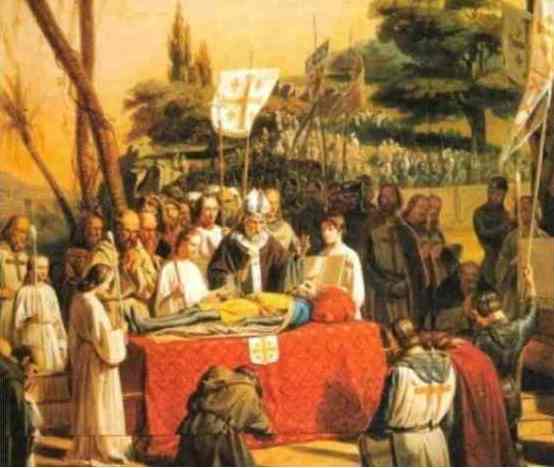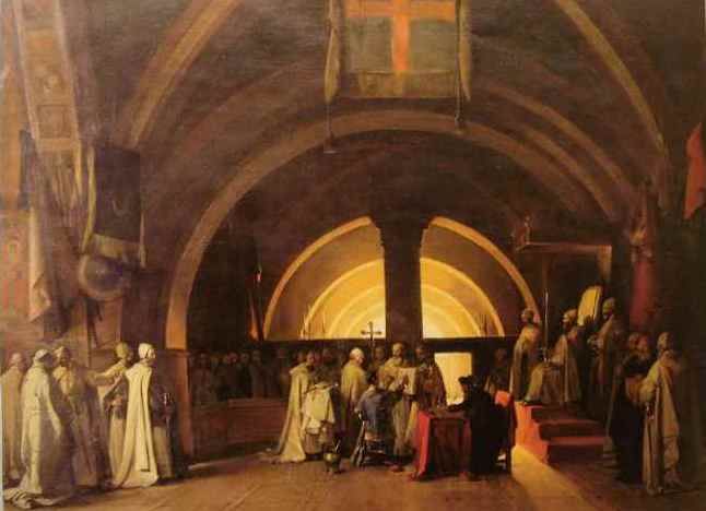 Рис. 23. 17 июля 1100 г. в Палестине во время осады Хайфы в возрасте 40 лет и через 5 недель после начала тяжелой болезни умер первый "король" Иерусалима француз Готфрид Бульонский. Похоронен он был рядом с Гробом Спасителя. Престол Иерусалима занял брат Годфрида – Бодуэн Бульонский. Иллюстрация – картина «Смерть графа Готфрида Бульонского», зал крестовых походов в Версале, 1842 г.