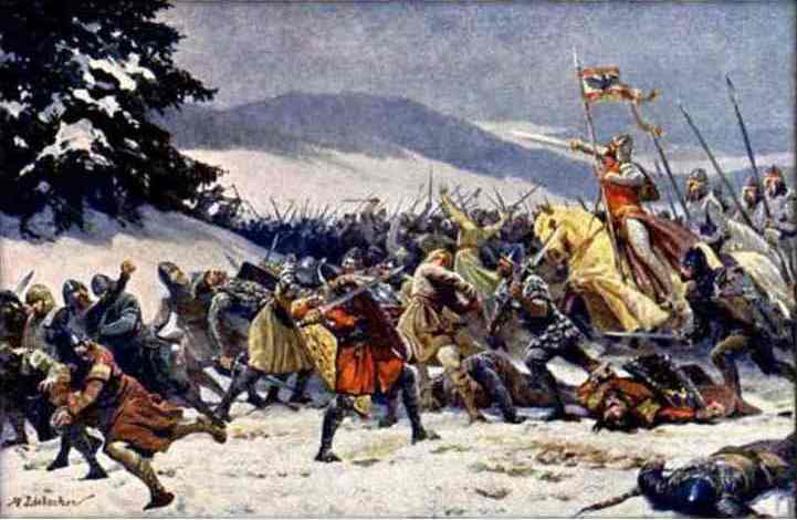 Рис. 24. 18 февраля 1126 г. в Богемии при Хлумце состоялась решающее сражение армий императора Священной Римской Империи Лотаря II и князя Чехии Собеслава I. Собеслав одержал победу, император был взят в плен, но затем отпущен, т.к. согласился на ограничение прав Римского императора в Богемии. Иллюстрация – Лейбшер «Витцеслав Собеслав I в Хлумце 18 февраля 1126 г.».