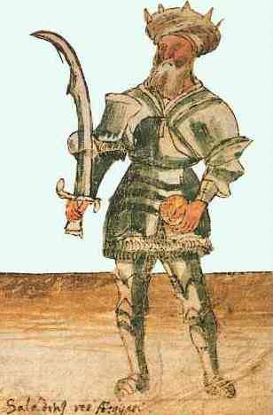 Рис. 28. 19 сентября 1187 г. войска Саладина – царя Египта – начали осаду Иерусалима, который обороняли французы. 2 октября французы открыли ворота Иерусалима, египтяне сбросили кресты с христианских церквей, разбили колокола, все храмы опрыскали розовой водой и окурили. Иллюстрация – царь Саладин – рисунок 15 века.