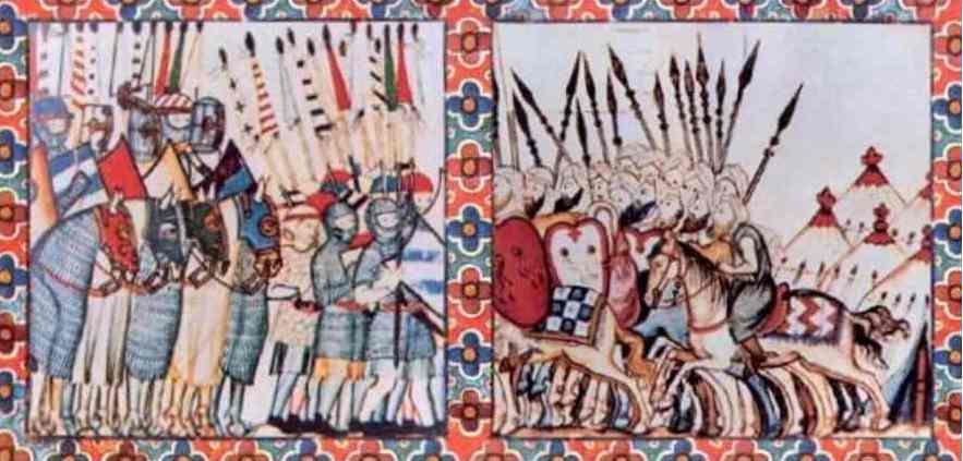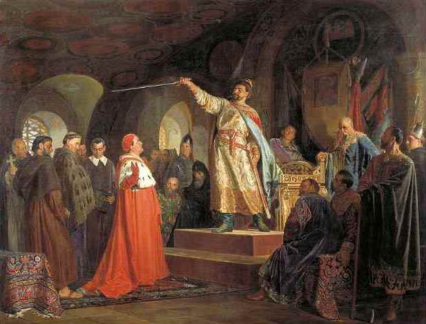 Рис. 32. 19 июня 1205 г. у Завихвоста на Висле в сражении с поляками погиб с большей частью своего войска волынский и галицкий князь Роман Мстиславович, захвативший в 1202 г. Киев. Иллюстрация – Неврев «Роман Галицкий принимает послов папы Иннокентия III», 1875.