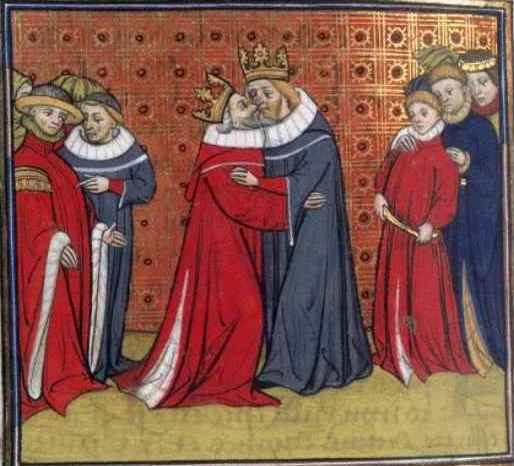 Рис. 43. 19 июня 1306 г. в битве у деревни Метвен в центральной Шотландии войска короля Шотландии Роберта Брюса наголову разбиты войсками кололя Англии Эдуарда I. Шотландия захвачена, король Роберт Брюс бежал на Гебридские острова, его жена и дочь захвачены англичанами. Иллюстрация – король Шотландии Роберт Брюс и Изабелла Марчская, средневековая английская иллюстрация.