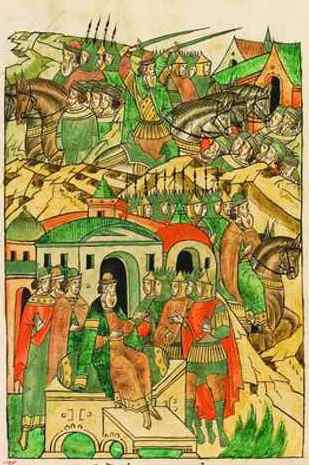 Рис. 37. 18 июня 1266 г. дружина псковского князя Довмонта разбила в битве на Западной Двине дружину полоцкого князя Герденя, Гердень убит. Литовец Довмонт стал править в Пскове и Полоцке. Иллюстрация – вокняжение князя Довмонта в Пскове, миниатюра 16 века.