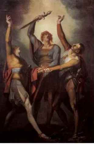 Рис. 44. 17 ноября 1307 г. представители кантонов Швиц, Ури, Унтервальден у озера Люцерн на лугу Рютли дали клятву взаимной помощи в борьбе с австрийскими Габсбургами,– так началась история Швейцарского союза. Иллюстрация – Фюссли «Клятва на Рютли», 1780.