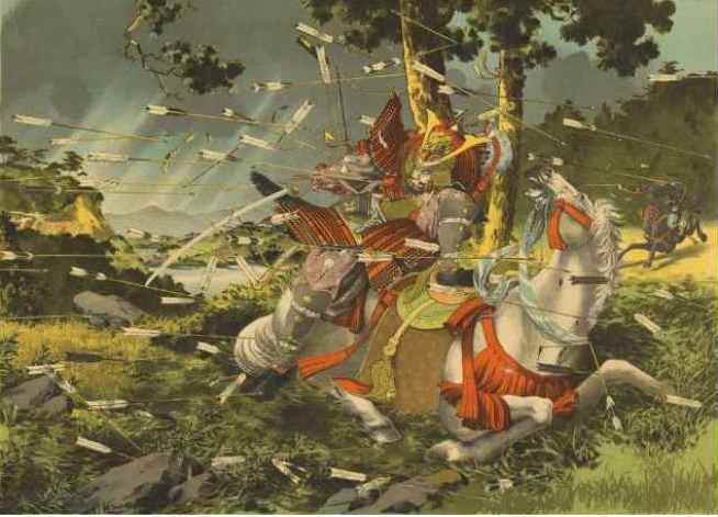 Рис. 47. 17 августа 1338 г. в провинции Ечизен в неожиданной стычке с вражеским отрядом убит знаменитый 37-летний самурай Нитта Йошисада, через год его отряды в Киото помогут в реставрации императору Го-Дайго. Иллюстрация – Цучия Коитсу «Убийство Нитта Йошисада», 1900.