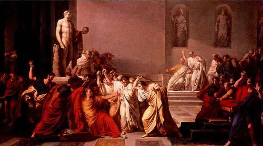 Рис. 6. 17 марта 44 г. до р.Х. через два дня после убийства Цезаря состоялось первое заседание сената, назначенное Марком Антонием. Марк Антоний решил объявить Цезарю посмертную амнистию, 19 марта прах Цезаря был похоронен с почетом, а его сторонники, пытавшиеся составить заговор, бежали из Рима. Иллюстрация – Виченцо Камуччини «Убийство Цезаря», 1798.