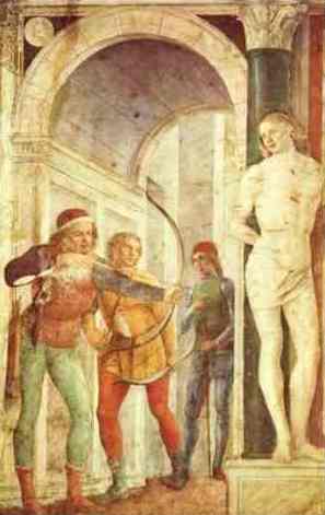 Рис. 10. 18 августа 288 г. в Риме расстрелян лучниками христианин командир отряда преторианцев Себастьян. После этого некая христианка его спасла, но, по преданию, его добили палками. Иллюстрация – Фоппа «Мученическая смерть Св. Себастьяна», 1498.