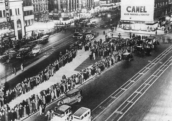 Рис. 15. 17 июня 1930 г. президент Герберт Гувер ввел в действие т.н. «Холей-Смут тариф» – увеличение импортной пошлины приблизительно на 20% в зависимости от вида товара. Это было реакцией его правительства на падение биржевых курсов. Политика изоляционизма, проводимая Гувером, положение еще более усугубило – в октябре 1930 г. индексы в США стали падать сильнее, безработица расширялась. На фото безработные стоят на Таймс-сквере в Нью-Йорке в 1930 г.