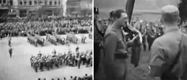 Рис. 19. В ночь с 17 на 18 октября 1931 г. Адольф Гитлер и его сподвижники провели грандиозный массовый марш 100.000 нацистов в Брауншвейге. На кадрах из кинохроники 18 октября 1931 г. батальоны штурмовиков идут по городу, Гитлер принимает присягу.