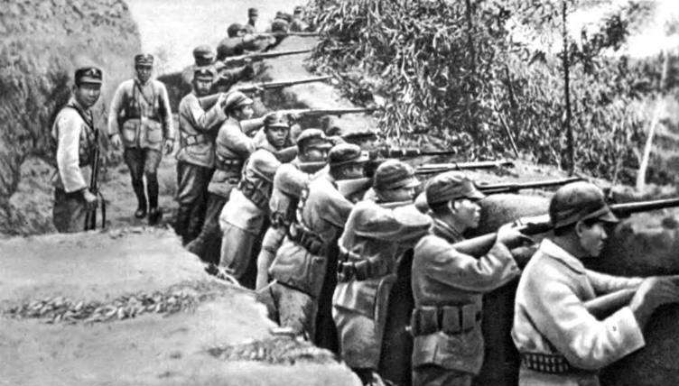 Рис. 22. 18 января 1932 г. начались столкновения японцев и китайцев в Шанхае. В этот день у ворот китайской фабрики в Чапее (предместье Шанхая) произошла драка между японцами и китайцами. Японцы подожгли китайскую фабрику, убили нескольких китайцев и затем нагло потребовали от китайского мэра Большого Шанхая удовлетворения. Мэр Большого Шанхая поспешил удовлетворить все требования японцев. Тем не менее, в Шанхай из Японии были вызваны два японских крейсера с морской пехотой и 16 истребителей. Поздно вечером 28 января раздалась неожиданная ружейная и пулемётная стрельба японских войск, занявших Чапей. На рассвете бомбардировщики забросали бомбами Чапей, где проживало исключительно гражданское китайское население. На фото китайские войска ведут оборону Шанхая от японских агрессоров.
