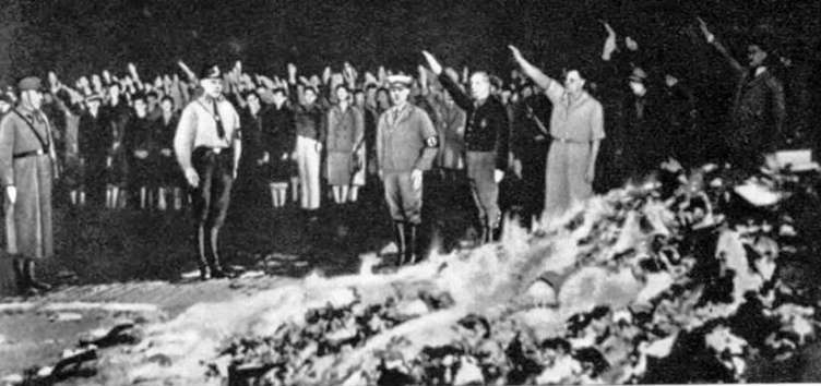 Рис. 25. 17 мая 1933 г. в Гейдельберге студенты начали сжигать книги не соответствующие «германскому духу». Читаем Эванса: «В Гейдельберге, где сожжение книг произошло 17 мая, студенты шествовали с горящими факелами в сопровождении людей СС, СА и стальных шлемов, а также членов дуэльного общества и бросали коммунистические и социал-демократические флаги в огонь вместе с книгами. Все это сопровождалось пением Песни Хорста Весселя и национального гимна. В произносившихся речах это мероприятие представлялось как удар против «антигерманского духа». На фото члены СС, СА, Стального шлема и простые студенты – «ботаники» жгут книги в Берлине.