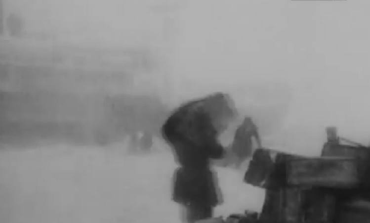 Рис. 27. 19 сентября 1933 г. у острова Колючино на самом востоке Северного Ледовитого океана пароход «Челюскин» застрял во льдах. Началась эпопея «Челюскина»: 13 февраля 1934 г. пароход раздавила подвижка льдов и он затонул, после чего спасение моряков и членов научной экспедиции длилось до 13 апреля 1934 г. На кадре из кинохроники – пароход «Челюскин» застрял в арктических льдах, метель, экипаж и научная экспедиция выгружаются на лед.