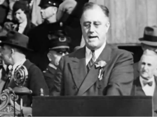 Рис. 28. 17 ноября 1933 г. США заявляют о признании СССР и восстанавливают с ним торговые отношения. Причина была в том, что с начала 1933 г. президентом США работает Франклин Рузвельт. Экономика США продолжала находится в депрессии, но президент Рузвельт объявил «новый курс», в т.ч. он решил торговать с коммунистами. При этом «новым» курс был только в экономике, а в политике курс был прежний и первым послом США в СССР был назначен ярый антисоветчик и антикоммунист Уильям Буллит. На кадре из кинохроники президент США Рузвельт объявляет об установлении дипломатических отношений с СССР.