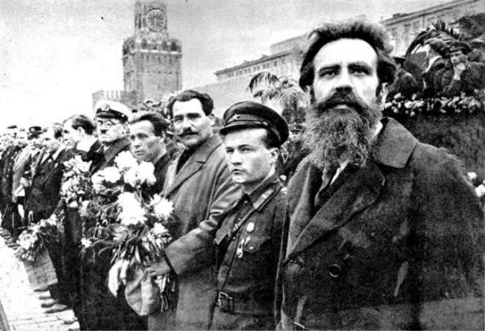 Рис. 29. 19 июня 1934 г. Москва торжественно встречала героических челюскинцев. Рыбас пишет: «в 1934 году, 19 июня, Москва встречала спасенный экипаж парохода «Челюскин» (вывезли с льдины самолетами), и Сталин, выступая на приеме в Кремле в честь челюскинцев и летчиков, сказал: «Герои Советского Союза проявили то безумство храбрых, которому поют славу. Но одной храбрости мало. К храбрости нужно прибавить организованность, ту организованность, которую проявили челюскинцы на льдине. Соединение храбрости и организованности делает нас непобедимыми». На фото челюскинцы у Мавзолея 19 июня 1934 г. Крайний справа Отто Шмидт.