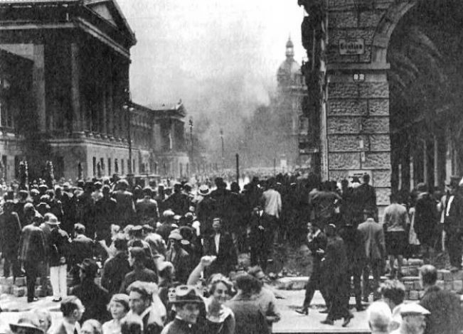 Рис. 4. 17 июля 1927 г. в Вене по приказу канцлера Австрии Игнаца Зайпеля разогнаны длившиеся с 15 июля антифашистские демонстрации трудящихся. Такой подарок сделал себе канцлер Зайпель к 51-му дню рождения – 19 июля 1927 г. На фото от 15 июля 1927 г. горит Дворец Юстиции в Вене, демонстранты и войска на улицах.