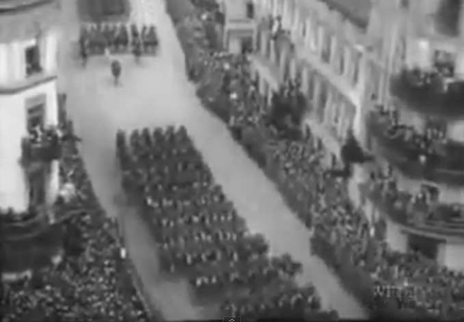 Рис. 31. 18 мая 1935 г. в Кракове состоялись траурные мероприятия, вызванные кончиной 12 мая 1935 г. на 67-м году жизни от онкологии президента Юзефа Пилсудского – создателя новой Польши. Матвеев пишет: «Утром 18 мая (1935) траурный поезд прибыл в Краков. Здесь его встречали первые лица государства, приехавшие из Варшавы ночью, дипломатический корпус, городские руководители, представители духовенства. После краткой молитвы, прочитанной краковским митрополитом Адамом Сапегой, гроб установили на артиллерийский лафет, и траурная процессия двинулась на Вавель». На кадре кинохроники жители Кракова и военная траурная процессия, 18 мая 1935 г.