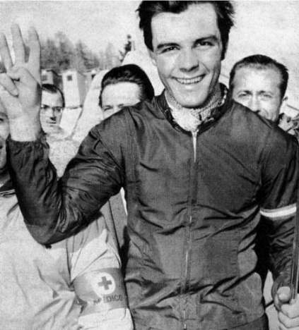 Рис. 32. 17 ноября 1935 г. в Китцбюэле, Австрия, родился Тони Зайлер – горнолыжник. В 1956 г. на Олимпиаде в Кортина Д’Ампеццо, итальянском горном курорте, он первым выиграл 3 золота – в слаломе, гигантском слаломе и в скоростном спуске. Смелость Зайлера сочеталась у него с техникой и скоростью, а соревновался он в толстом вязаном свитере, что добавляло ему особенного шарма. В 1959 г. Зайлер снялся в видовом фильме о горных лыжах – комедии «Двенадцать девушек и один мужчина» – фильм был очень популярен в СССР,– Зайлер был интересным мужчиной. Зайлер работал в сфере рекламы – что-то рекламировал из снаряжения – и в федерации лыж в 1957-58 гг. возникла дискуссия по совместимости любительского статуса Зайлера с его работой актером и моделью. В результате Тони Зайлер сам ушел из любителей и к играм 1960 г. не готовился. На фото трехкратный олимпийский чемпион австрийский горнолыжник Тони Зайлер в Кортина Д’Ампеццо в 1956 г.