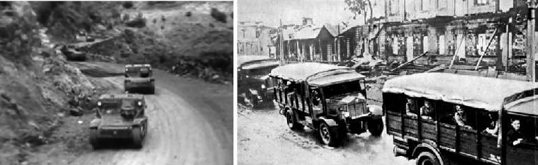 Рис. 33. 19 февраля 1936 г. в ходе контрнаступления итальянские войска на Северном фронте Итало-Эфиопской войны разбили войска раса Мулюгета и продолжили наступление на столицу Эфиопии. га. Аддис-Абебу. При этом итальянцы на фронте активно применяли отравляющие газы. Слева на кадре из кинохроники итальянская бронетехника в горах Эфиопии, справа на фото итальянские войска в мае 1936 г. входят в Аддис-Абебу.