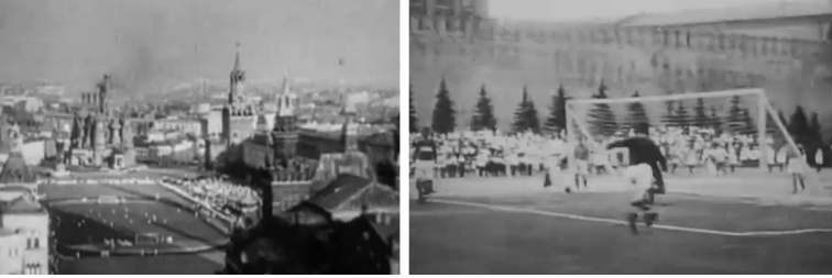 Рис. 34. 18 июля 1936 г. в День физкультурника на Красной площади в Москве прошел парад, а затем был сыгран футбольный матч. На кадрах кинохроники слева – футбольное поле у стен Кремля, справа момент матча. Играли Спартак-1 и Спартак-2, победил Спартак-1 – 4:3.