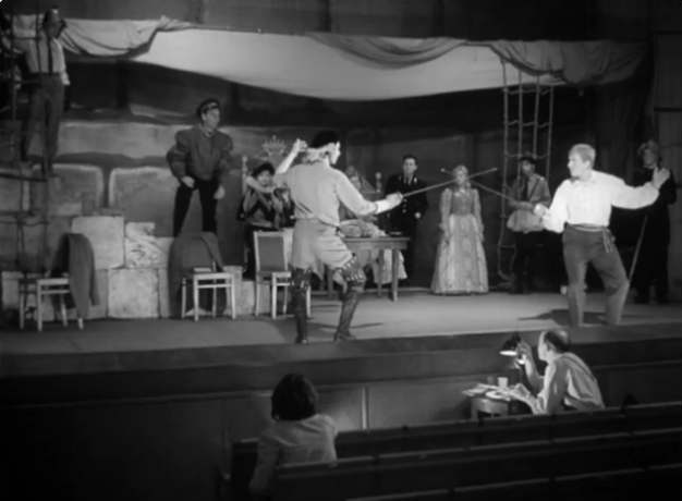 Рис. 5. 18 ноября 1927 г. в Куйбышеве родился Эльдар Рязанов – российский кинорежиссер-комедиограф. Рязанов известен многими фильмами, в первую очередь: «Карнавальная ночь» (1956), «Гусарская баллада» (1962), «Берегись автомобиля» (1966), «Ирония судьбы, или С легким паром» (1976). Умер 30 ноября 2015 г. в Москве. На кадре из фильма Эльдара Рязанова «Берегись автомобиля» эпизод репетиции – Лаэрт-Подберезовиков (Ефремов) слева – Гамлет-Деточкин (Смоктуновский) справа.