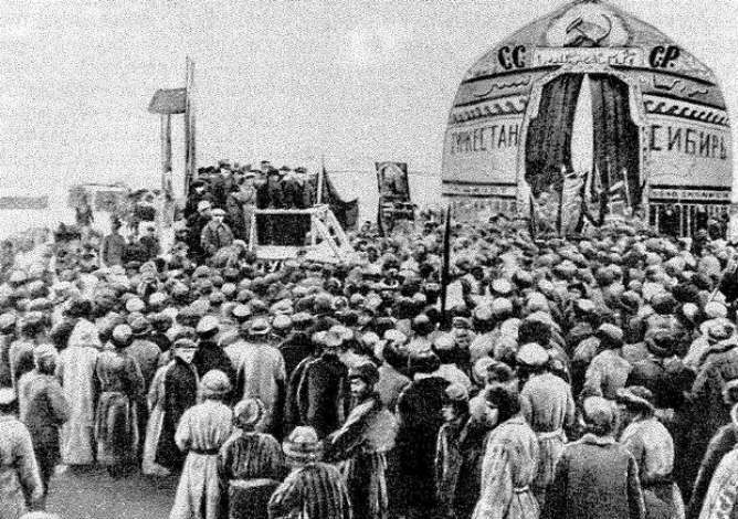 Рис. 6. 19 ноября 1927 г. на станции Луговая в Туркестане на ж.д. линии Фрунзе-Джамбул было уложено первое звено южного участка Турксиба – знаменитой стройки 1-й пятилетки. На фото митинг по случаю укладки первого звена южного участка Турксиба – Туркестано-сибирской железной дороги.