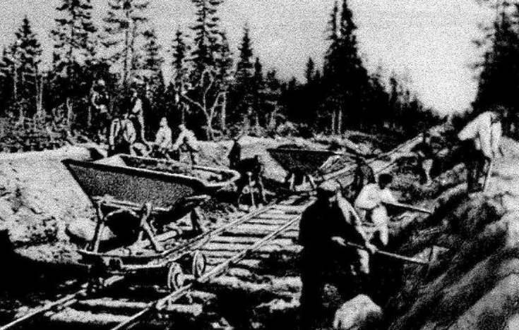 Рис. 7. 17 января 1928 г. в передовице казахской газеты «Советская степь» писали: «Кулак и спекулянт самые злейшие и самые опасные враги. В борьбе с ними не может быть никаких церемоний… Мы не можем сейчас допустить, чтобы кучка отъявленных врагов Советской власти набивала себе карманы, играя на срыве хлебозаготовок». Так в СССР началась борьба с «врагами». В этот же день 17 января 1928 г. из Москвы в ссылку в Казахстан насильно поездом отправили Троцкого. Дверь квартиры Троцкого чекисты взломали, и самого Троцкого – беспощадного революционера и любимчика Ленина – вынесли в автомобиль на руках, т.к. Троцкий не открывал дверь, а затем отказывался идти. На фото заключенные концлагеря на Соловках строят узкоколейку.