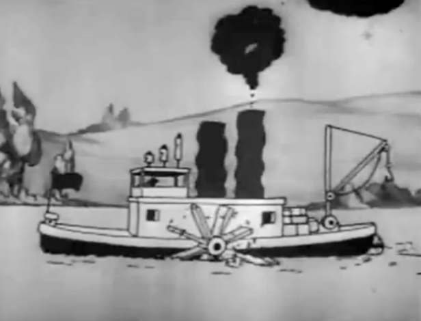 Рис. 9. 18 ноября 1928 г. в Нью-Йорке в «Colony Theater» на Бродвее показан первый звуковой мультфильм студии Диснея «Steamboat Willie» – «Пароход Вилли». На рис. кадр из начала первого звукового диснеевского мультфильма «Steamboat Willie».