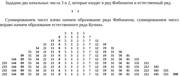Таким образом, ряды Фибоначчи и естественный ряд Кучина – математические родственники, но ряд Кучина более точный, а его члены встречаются в нашем физическом мире непосредственно в абсолютных значениях. Покажем правильность первого утверждения.