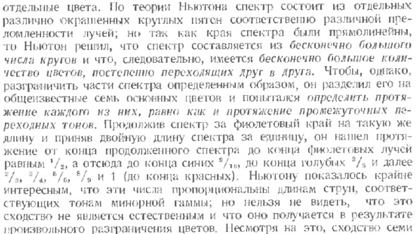 Второе известное физическое применение числа 7 – это семь цветов спектра, и взаимосвязанное с ним использование семи основных нот музыкальной гаммы. Основоположником деления спектра на семь цветов был великий англичанин Исаак Ньютон. Ньютон получил спектр в виде кругов, т.к. пользовался «чечевичной» линзой. Обычно приводят спектр в виде линий, но это именно образ, а не первый результат Ньютона. Крайне интересно, что Ньютон определил гамму цветов как минорную. Из описания из [8] следует, что «красный» цвет – это «ля», «оранжевый» – «си» и т. д. до «фиолетового» – «соль».