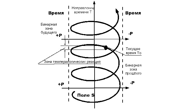 Поле непрерывно в ходе развития своего процесса «поджигает» его из прошлого в будущее. На границе этих двух бинарных состояний времени происходит темпералогическая реакция конструкции (деструкции) материи по формуле 7.