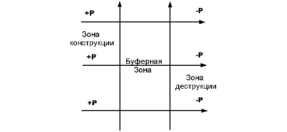 Потенция и ее полярность напрямую определяют какого вида реакции преобладают в данный момент времени To во вселенной. Поясним эту мысль. Бинарное свойство потенции приводит к двум зонам по краям входа линий потенции во вселенную и промежуточной зоне, как бы между ними двумя. (рис 4)