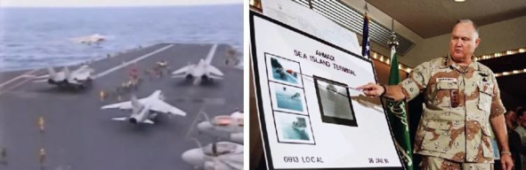 Буря в пустыне, слева авианосец США, справа командующий генерал Шварцкопф, кинохроника 17.01.1991.