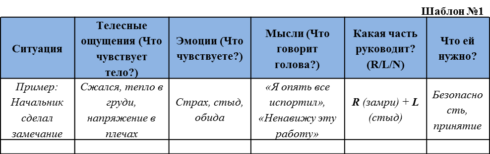 – Если сильные эмоции (страх, гнев, обида, жалость к себе, тяга к удовольствию) – вероятно, активна Л-система. Спросите: «Какая старая боль/удовольствие активировалась? Что нужно этой части (напоминает) – комфорт, подтверждение, защита?»