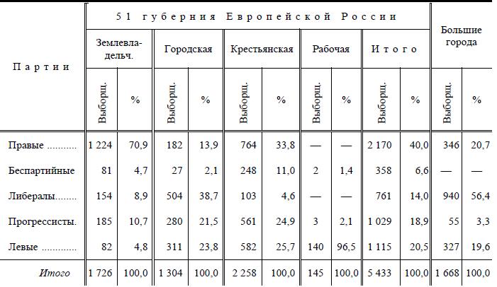Какая-нибудь дюжина выборщиков прогрессивного или левого блока могла лишь на почве счета быть поделена между отдельными партийными группами; в общем же эти цифры дают пока самый полный и надежный материал для понимания классового строения различных русских партий.