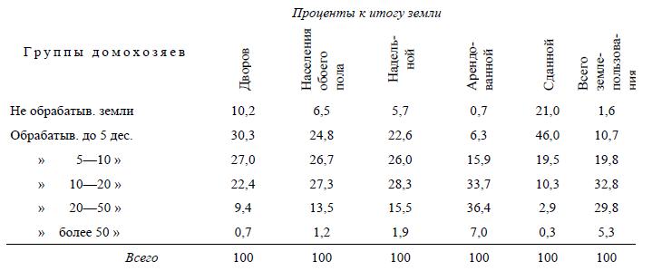 И здесь, следовательно, несмотря на значительно меньшие размеры посева, мы видим те же самые отношения между группами, ту же концентрацию посева и скота в руках небольшой группы зажиточного крестьянства Отношение между землевладением и действительным хозяйственным пользованием землей оказывается и здесь таким же, как в знакомых уже нам губерниях[68].