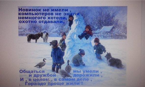 – Школа у нас большая, целый деревянный дом, в нем посредине печь стоит, зимой так здорово в ней трещат дрова, а тепло от нее во все классные комнаты проходит. Печь топит в школе бабушка Галя, а еще звонит в медный колокольчик, когда надо начинать уроки или идти на перемену.