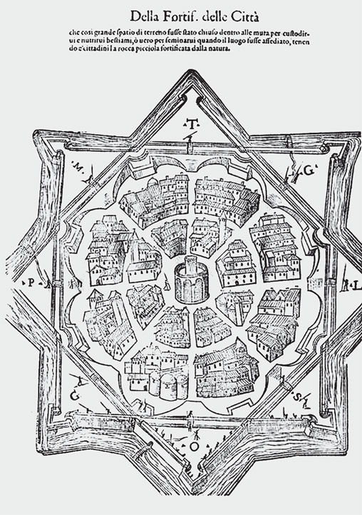 Проектируя «идеальные» города (как, впрочем, и реальные), мастера эпохи Возрождения не могли, конечно, не учитывать суровых обстоятельств современной им жизни. Это, кроме всего прочего, потребовало большого внимания к проблеме защиты городов от нападения извне. На смену каменным стенам и башням, с давних пор окружавшим средневековые города, но неуклонно терявшим свою надежность в условиях применения огнестрельного оружия, постепенно пришли укрепления нового, бастионного типа. Их регулярная структура, основанная на применении ритмично чередующихся, выступающих вперед бастионов, соединенных прямолинейными участками крепостных валов, называемыми куртинами, своим орнаментальным «геометризмом» хорошо соответствовала столь же регулярно построенным планам городов и поэтому вполне могла составить с ними одно гармоничное целое.