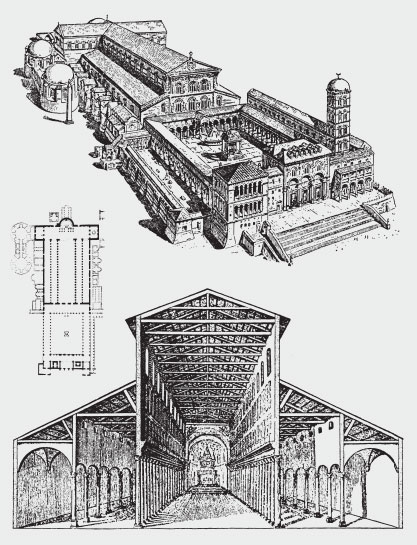 Изучая архитектуру, ни в коем случае нельзя обходить вопрос о ее конструктивно-технических основах. Итальянское зодчество эпохи Возрождения развивалось в основном на базе строительных традиций Древнего Рима, где впервые в Европе большое формообразующее значение приобрели криволинейные перекрытия пролетов – арки, своды, а затем и купола, возводившиеся с применением не только камня, но и изобретенного римлянами бетона. Опорами перекрытий подобного типа служили, как правило, мощные каменные стены. Римская строительная техника оказала значительное влияние на развитие средневековой архитектуры как в Византии, так и в странах Центральной и Западной Европы. Сложившийся под этим влиянием стиль раннего европейского Средневековья получил много позже название романского (от слова «Roma», то есть Рим), чем и было подчеркнуто его происхождение. Одним из ведущих типов зданий в романском зодчестве стал храм, решавшийся в форме базилики – монументального каменного сооружения, имеющего план в форме прямоугольника или вытянутого в длину «латинского креста», перекрытого тяжелыми сводами, опирающимися не только на стены, но и на массивные пилоны в интерьере; последние подразделяют внутреннее пространство базилики на несколько параллельных друг другу нефов, причем средний неф по ширине и высоте превосходит боковые. Самым характерным внешним признаком романских сооружений является мотив полуциркульной арки. Арками такой формы завершаются окна, словно с громадным усилием прорубленные в толще каменных стен; арки вместе с опорами сводов своим уверенным ритмом организуют внутреннее пространство, выявляя в перспективе динамику его развития от входа на западном фасаде к алтарной апсиде, завершающей храм с востока. Аркады, составленные из сравнительно небольших арок, опирающиеся на приземистые колонки, своими пропорциями и формой уже довольно сильно отличающиеся от своих античных прототипов, часто использовались в оформлении клуатров – замкнутых двориков при храмах и монастырях.