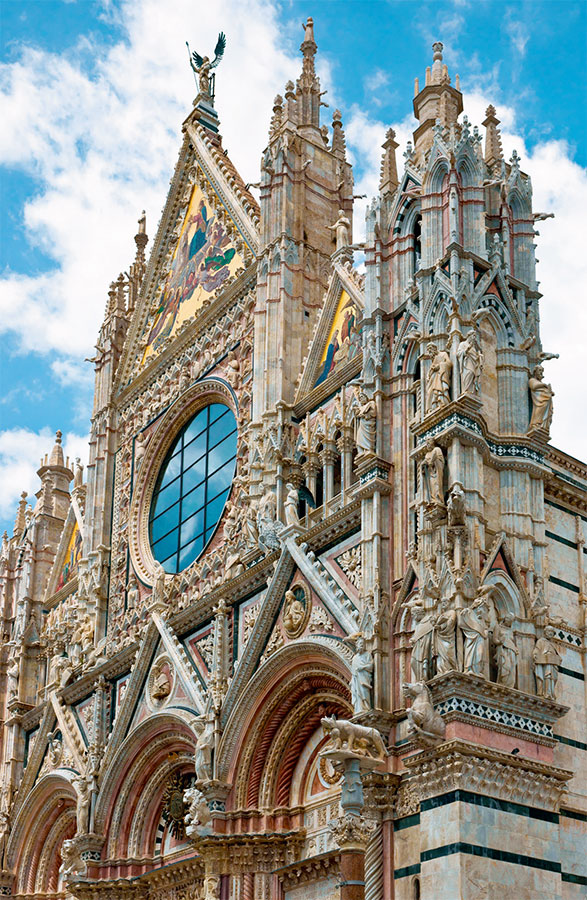 Как и в большинстве других случаев, связанных с трудоемкой работой по сооружению громадных средневековых соборов, возведение и украшение Дуомо потребовало очень длительного времени, усилий многих строителей и художников. Полагают, что первоначальный замысел собора принадлежит Джованни Пизано. Он же начал возведение западной фасадной стены, доведенной под его руководством в самом конце XIII века до уровня горизонтального карниза над порталами. Верхнюю часть главного фасада осуществили лишь в 1370-х годах под наблюдением Джованни ди Чекко. В XIV веке построили также кампанилу. В отделке интерьера возможно участие Никколо Пизано. Долго, с 1369 года и до середины XVI столетия, выкладывался мозаичный пол собора. Этот пол – одна из самых знаменитых достопримечательностей Сиены. В его композиции орнаментальные мотивы сочетаются с тематическими изображениями, обладающими большой самостоятельной художественной ценностью. Историками установлено, что в течение почти двухсот лет в создании пола Дуомо, названного П. Муратовым «колоссальной гравюрой на мраморе», принимали участие около пятидесяти мастеров[71]. Важная роль в интерьере принадлежит кафедре, исполненной в 1266–1268 годах в соответствии с замыслом Никколо Пизано (в реализации этого замысла участвовали также его сын Джованни Пизано и талантливый ученик Арнольфо ди Камбио, которому суждено было самостоятельно создать великие произведения искусства немного позже). В архитектурно-скульптурной композиции кафедры сиенского собора получили развитие приемы, найденные старшим Пизано при создании кафедры баптистерия в Пизе; о ней речь впереди. В восточном конце собора перспектива церковного зала замыкается алтарем, созданным в 1480-х годах ломбардским скульптором Андреа Бреньо.