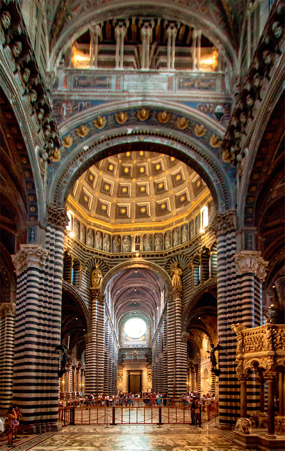Сильное впечатление производит интерьер сиенского Дуомо. Он воспринимается как многоголосый хорал, исполняемый на органе. Нефы храма перекрыты крестовыми сводами, ограниченными мощными полуциркульными арками, опирающимися на массивные столбы. Пространство собора пронизано цветом: полихромные орнаменты украшают перекрытие и мозаичный пол; цветные кессоны с золочеными розетками расположены на нижних поверхностях арок между нефами; свою лепту в создание впечатления исключительного декоративного богатства интерьера вносят разноцветные горизонтальные полосы на стенах и опорах, продолжающие внутри храма тему его фасадов. Важная роль в интерьере принадлежит куполу, легко поднимающемуся над средокрестием. Его поверхность тоже декорирована кессонами с золочеными звездами в них, а в вершине размещено круглое световое отверстие, напоминающее «глаз Пантеона». Правда, по размерам венчание сиенского собора сильно уступает своему римскому прототипу, а на его вершине возвышается фонарь, которого нет над куполом Пантеона. И все же, конечно, в куполе Дуомо мы вправе увидеть своеобразный символ верности средневековых строителей традициям Античности, продолжавшим жить в Италии спустя многие столетия после того, как Античность стала далекой историей.