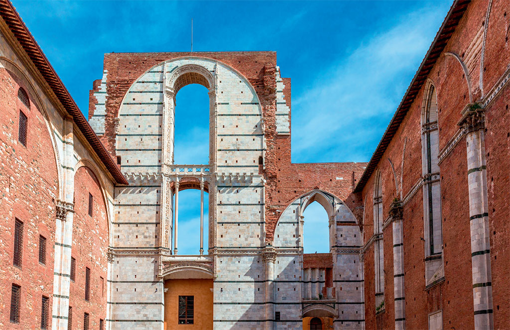 Собор Сиены, даже и сейчас впечатляющий своими размерами, в далеком от нас Треченто, видимо, не вполне устраивал граждан этой городской республики в качестве сооружения, способного олицетворять силу и амбиции извечной соперницы Флоренции. Именно поэтому в 1339 году решено было начать рядом строительство второго собора; будучи соединенным с уже существующим зданием (коему надлежало превратиться в трансепт нового храма), он должен был превзойти размерами и роскошью отделки флорентийский собор Санта-Мария дель Фьоре. Однако эпидемия чумы, унесшая в 1348 году жизни большинства жителей Сиены, вынудила прервать уже начавшиеся строительные работы. О неосуществленном замысле напоминают возвышающиеся рядом с Дуомо опоры новых нефов и частично возведенные стены.