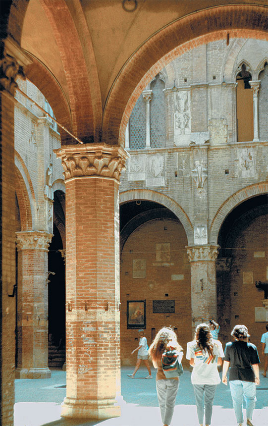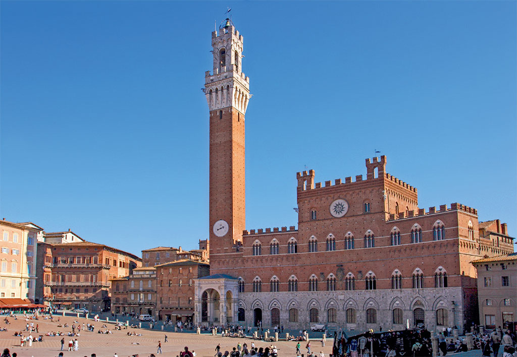 В Сиене XIV столетия Торре дель Манджа была далеко не единственной постройкой такого типа. Как и в других итальянских городах, в городе было возведено немало жилых башен, служивших надежным укрытием для переселившихся сюда окрестных феодалов. Ни одна из них не сохранилась. Однако представить себе Сиену эпохи Треченто мы все-таки можем: этому способствует огромная фреска работы Амброджо Лоренцетти, доныне украшающая зал Совета девяти в палаццо Публико. Исполненная в 1337–1339 годах, фреска стала частью живописного оформления зала, созданного Амброджо вместе со старшим братом Пьетро и посвященного теме, имевшей важное для государства идейное и воспитательное значение: «Плоды доброго и злого правления». Работая над аллегорией «доброго правления», Амброджо поделил монументальное полотно на две части изображением городской стены с башней, на которой можно видеть древний символ – Капитолийскую волчицу, служившую эмблемой не только Рима, но и Сиены. Слева от стены художник поместил огромную панораму города, воспринимаемую как бы с площади перед ратушей. Рассматривая ее, современный зритель легко узнает на ней знакомый силуэт Дуомо с высокой кампанилой, но идентифицировать большинство остальных включенных в панораму фрагментов нам, по-видимому, не удастся. Это и неудивительно: за прошедшие столетия в Сиене многое переменилось, хотя город смог в основном сохранить свой проторенессансный характер. Из того, что в городе воочию увидеть теперь нельзя, на фреске Лоренцетти обращают на себя внимание прежде всего именно башни – высокие и пониже, увенчанные зубцами, с арками на стенах или без них; тут и там они поднимаются над жилыми домами, имеющими, как и башни, весьма суровый облик, что делает их похожими на небольшие крепости. Лишь передний план картины с многочисленными фигурами горожан более приветливо раскрывается к зрителю аркадами первых этажей, где обычно располагались лавки торговцев и менял. В целом поистине эпическое полотно Лоренцетти поражает своим информационным богатством, своего рода энциклопедичностью; это позволяет посетителям палаццо Публико, как в настоящем музее, ощутить себя словно шагнувшими в далекую историю.